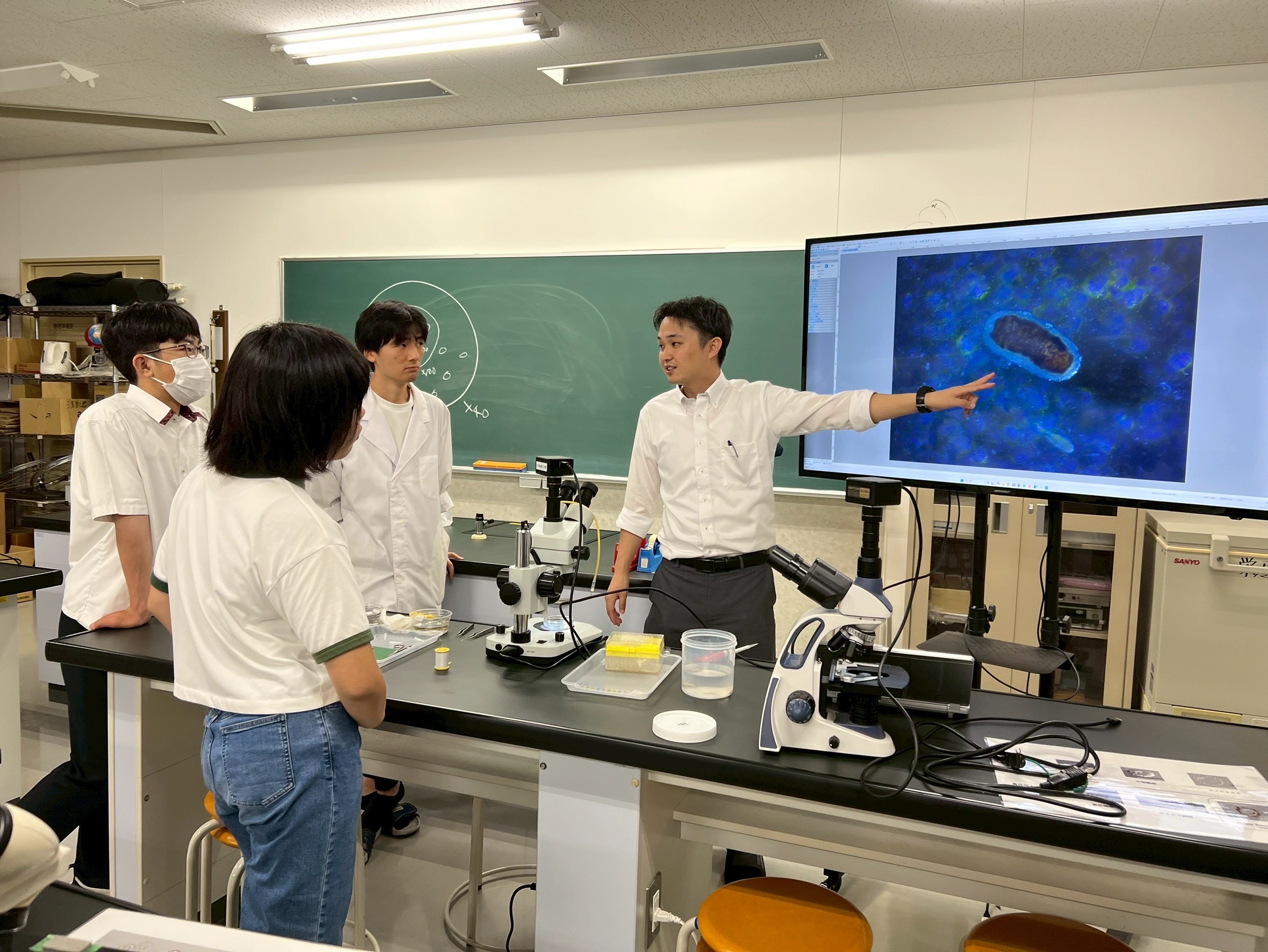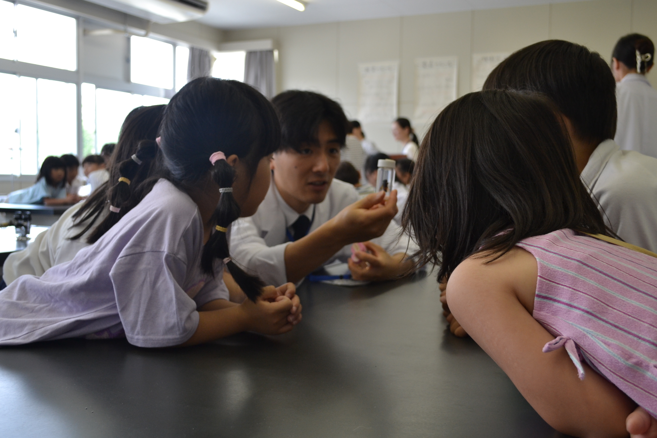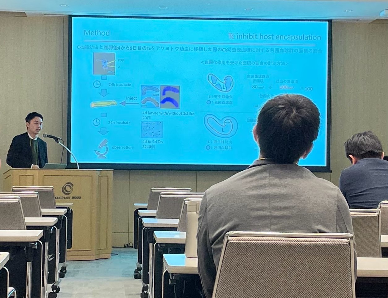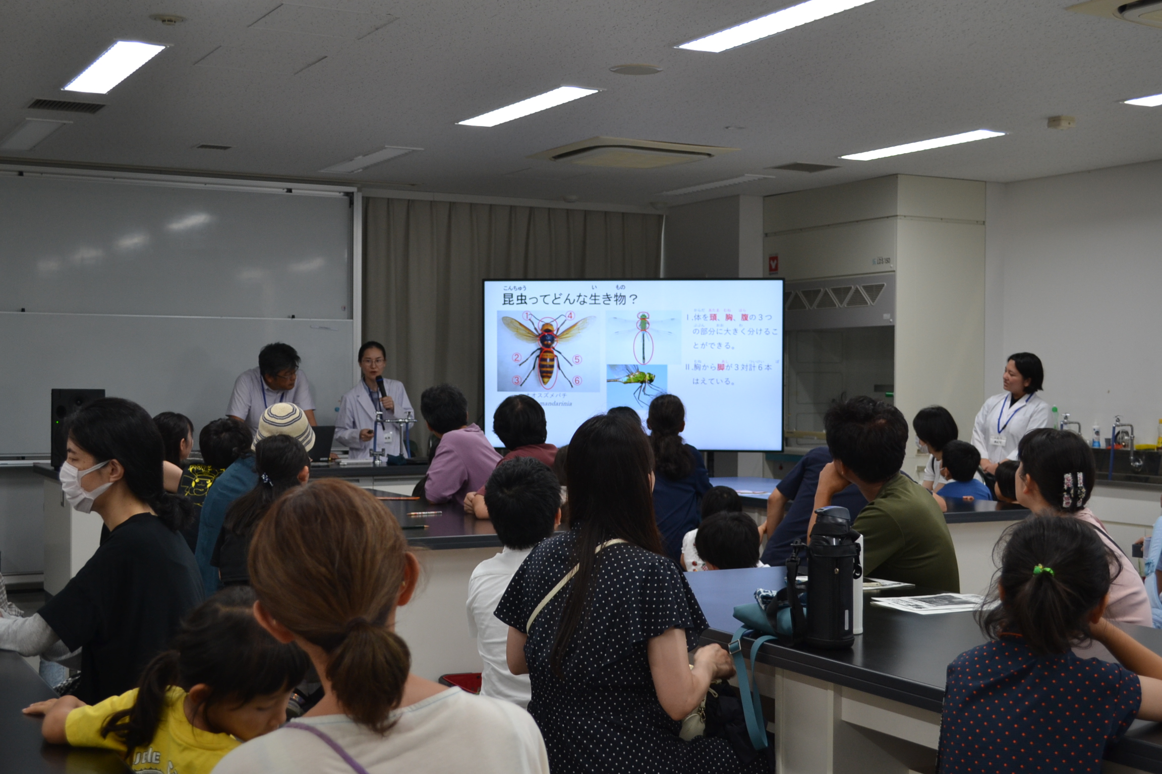 また、本研究室が開発した昆虫を用いた教材をワークショップにて紹介しました。ワークショップには、中松豊教授と学部4、3年生計7名が参加し、アワヨトウや寄生蜂、カメムシなどの昆虫を用いた教材を参加者に体験してもらいました。アジア諸国の研究者や教員が多く訪れ、教材の作成方法や出前授業の実施方法について、活発に意見交換しました。